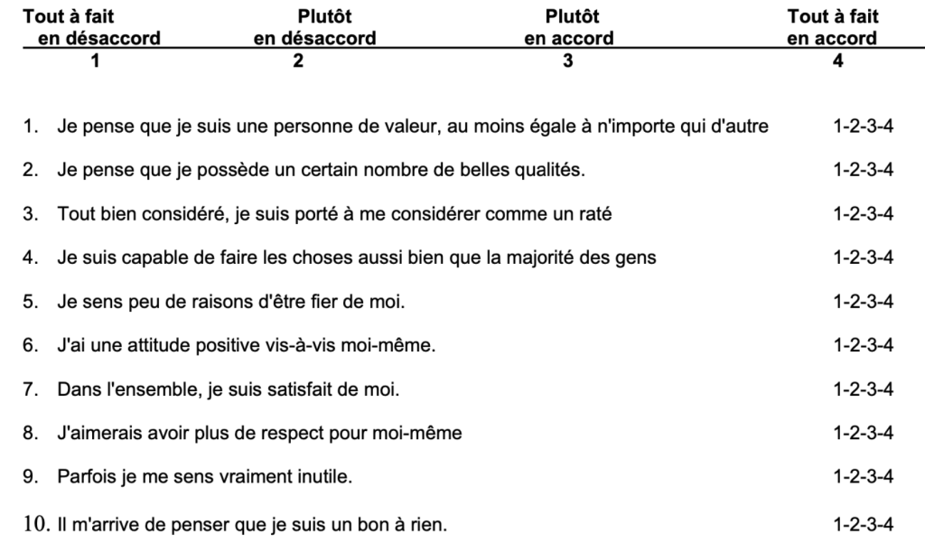 D’après Rosenberg, l’estime de soi peut se définir comme « une orientation positive ou négative envers soi-même ; une évaluation globale de sa valeur ». Autrement dit, c’est ce que la personne pense qu’elle vaut. Ce dernier a présenté une échelle de l’estime de soi (annexe 2), qu’un praticien peut proposer à ses patients, elle permet d’évaluer la valeur que l’individu se donne. Grâce à cet outil, il est plus facile de dégager des axes de travail et des points à améliorer, mais aussi de mieux comprendre la personne.