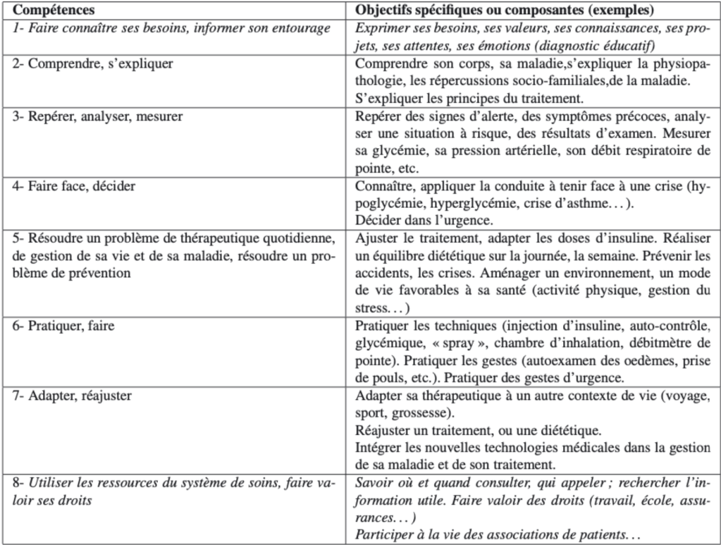 (7) d’Ivernois, J. F. & Gagnayre, R. (2011). Compétences d’adaptation à la maladie du patient : une proposition. Education Thérapeutique du Patient – Therapeutic Patient Education, 3(2), S201-S205. https://doi.org/10.1051/tpe/2011103